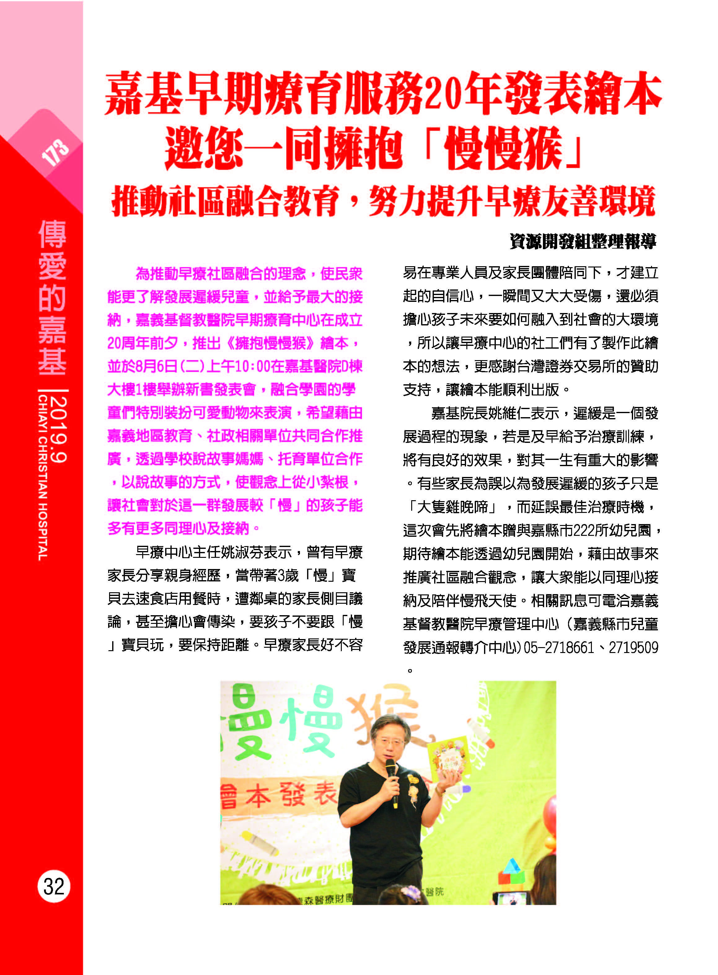 嘉基早期療育服務20年發表繪本 邀你一同擁抱「慢慢猴」推動社區融合教育,努力提升早療友善環境