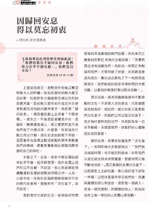 歸回安息,其實就是讓我們「活在當下」。如同布倫大主教曾指出:「我們無法超越時間,也不能回到過去;如果我們只是在過去與未來間擺盪,那麼時間只會不斷地流逝。」真正重要的是專注在當下,以因著對上主的信靠,專心做好當下的每一件事;以堅持基督所呼召我們的,照護與醫療的初心和使命,面對每一個病人;把每一個所遇到、所關懷的病人,視為這世界上唯一存在的人來關心來照顧。