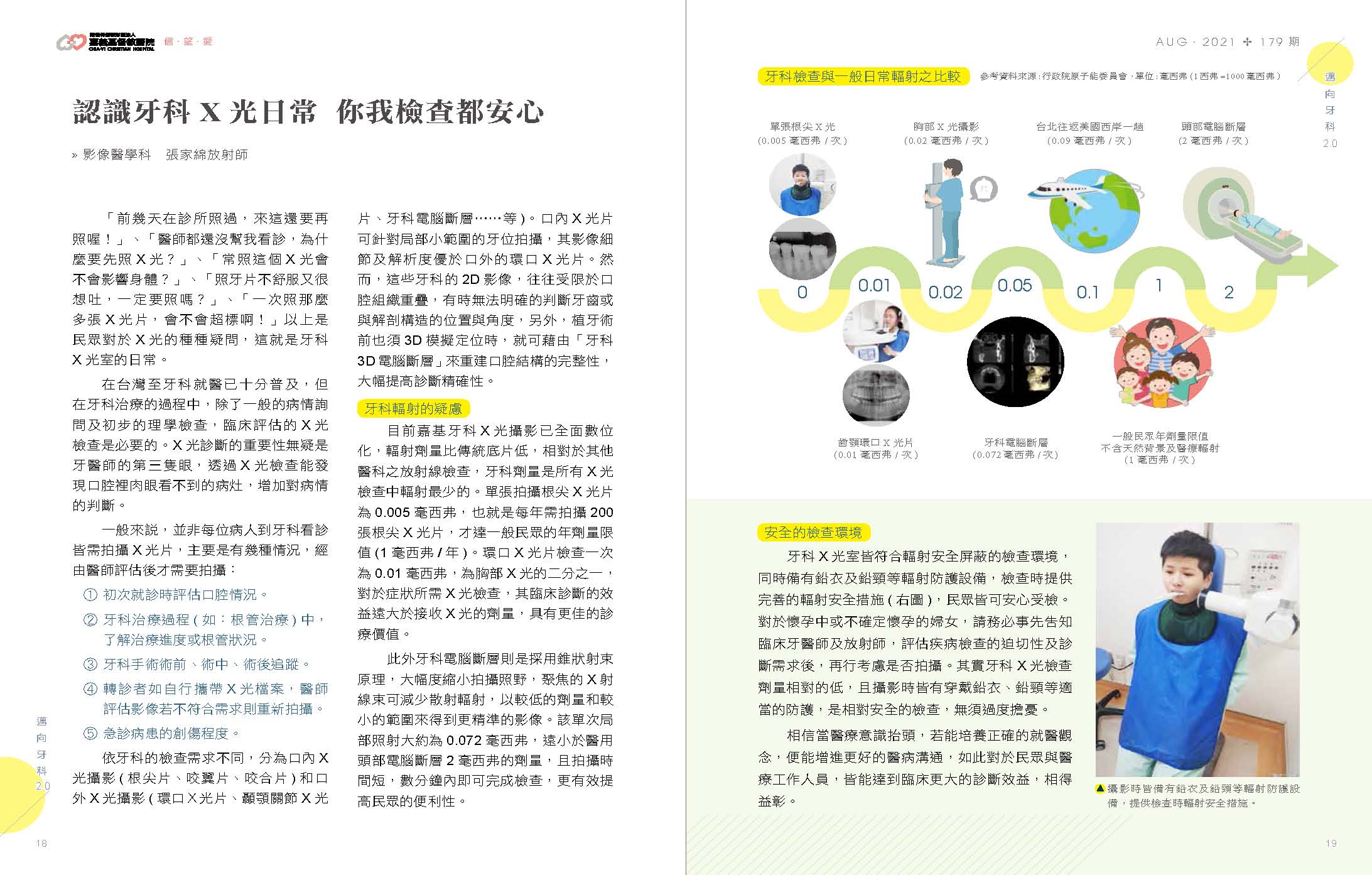 在台灣至牙科就醫已十分普及,但在牙科治療的過程中,除了一般的病情詢問及初步的理學檢查,臨床評估的X光檢查是必要的。X光診斷的重要性無疑是牙醫師的第三隻眼,透過X光檢查能發現口腔裡肉眼看不到的病灶,增加對病情的判斷。