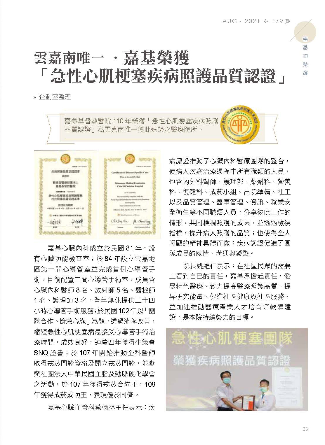 雲嘉南唯一 嘉基榮獲「急性心肌梗塞疾病照護品質認證」