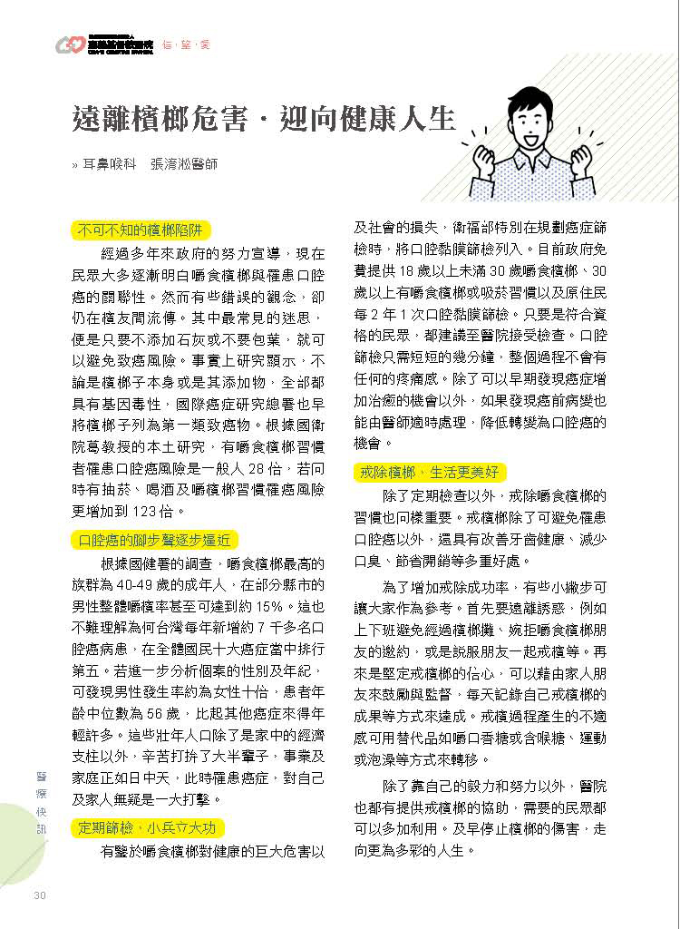 除了靠自己的毅力和努力以外,醫院也都有提供戒檳榔的協助,需要的民眾都可以多加利用。及早停止檳榔的傷害,走向更為多彩的人生。