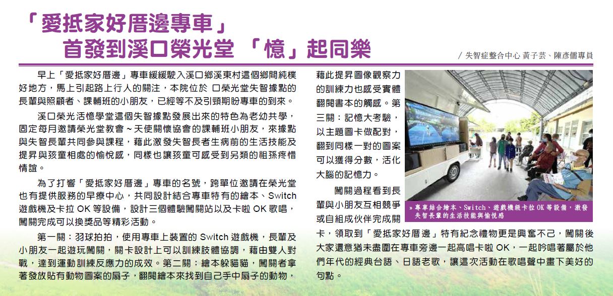 早上「愛抵家好厝邊」專車緩緩駛入溪口鄉溪東村這個鄉間純樸好地方,馬上引起路上行人的關注,本院位於 口榮光堂失智據點的長輩與照顧者、課輔班的小朋友,已經等不及引頸期盼專車的到來。溪口榮光活憶學堂這個失智據點發展出來的特色為老幼共學,固定每月邀請榮光堂教會~ 天使關懷協會的課輔班小朋友,來據點與失智長輩共同參與課程,藉此激發失智長者生病前的生活技能及
