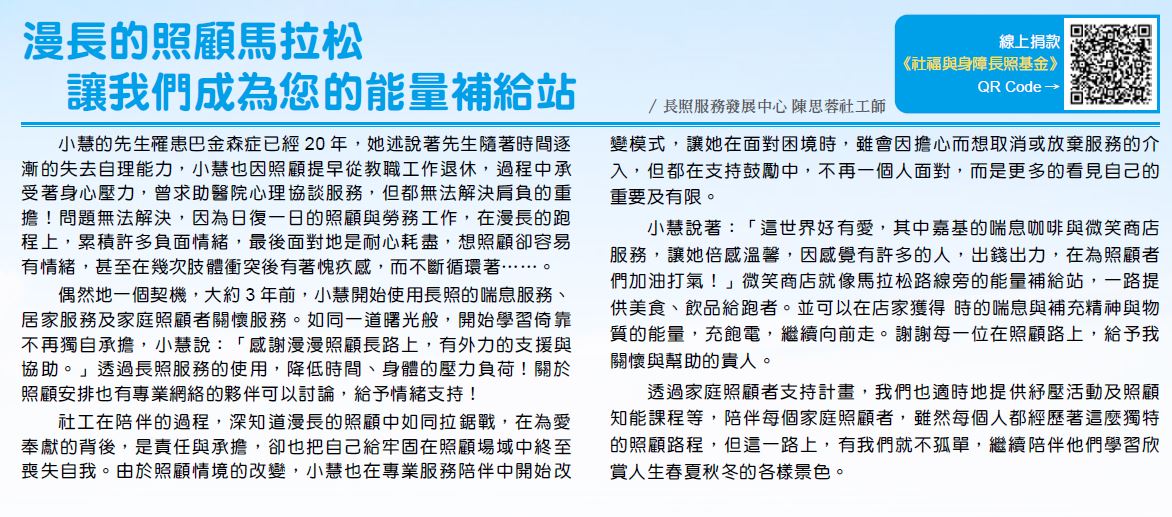 的照顧路程,但這一路上,有我們就不孤單,繼續陪伴他們學習欣賞人生春夏秋冬的各樣景色。