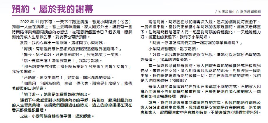 2022 年11 月下旬,一天下午踏進病房,看見小梨阿姨(化名)獨自一人坐在病床上,看上去精神飽滿,家人剛好外出,讓我有一些時間陪伴與傾聽阿姨的內心想法,從罹患肺癌至今已7 個多月,瞭解到她完成人生想做的事,對後事也有所預備。