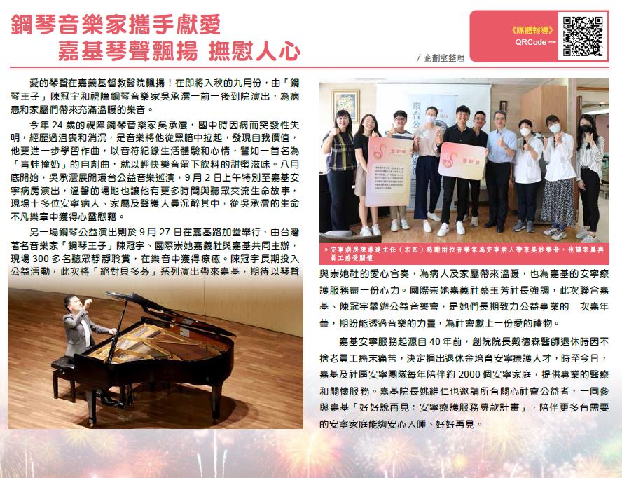 另一場鋼琴公益演出則於9 月27 日在嘉基路加堂舉行,由台灣著名音樂家「鋼琴王子」陳冠宇、國際崇她嘉義社與嘉基共同主辦,現場300 多名聽眾靜靜聆賞,在樂音中獲得療癒。陳冠宇長期投入公益活動,此次將「絕對貝多芬」系列演出帶來嘉基,期待以琴聲與崇她社的愛心合奏,為病人及家屬帶來溫暖,也為嘉基的安寧療護服務盡一份心力。國際崇她嘉義社蔡玉芳社長強調,此次聯合嘉基、陳冠宇舉辦公益音樂會,是她們長期致力公益事業的一次嘉年華,期盼能透過音樂的力量,為社會獻上一份愛的禮物。