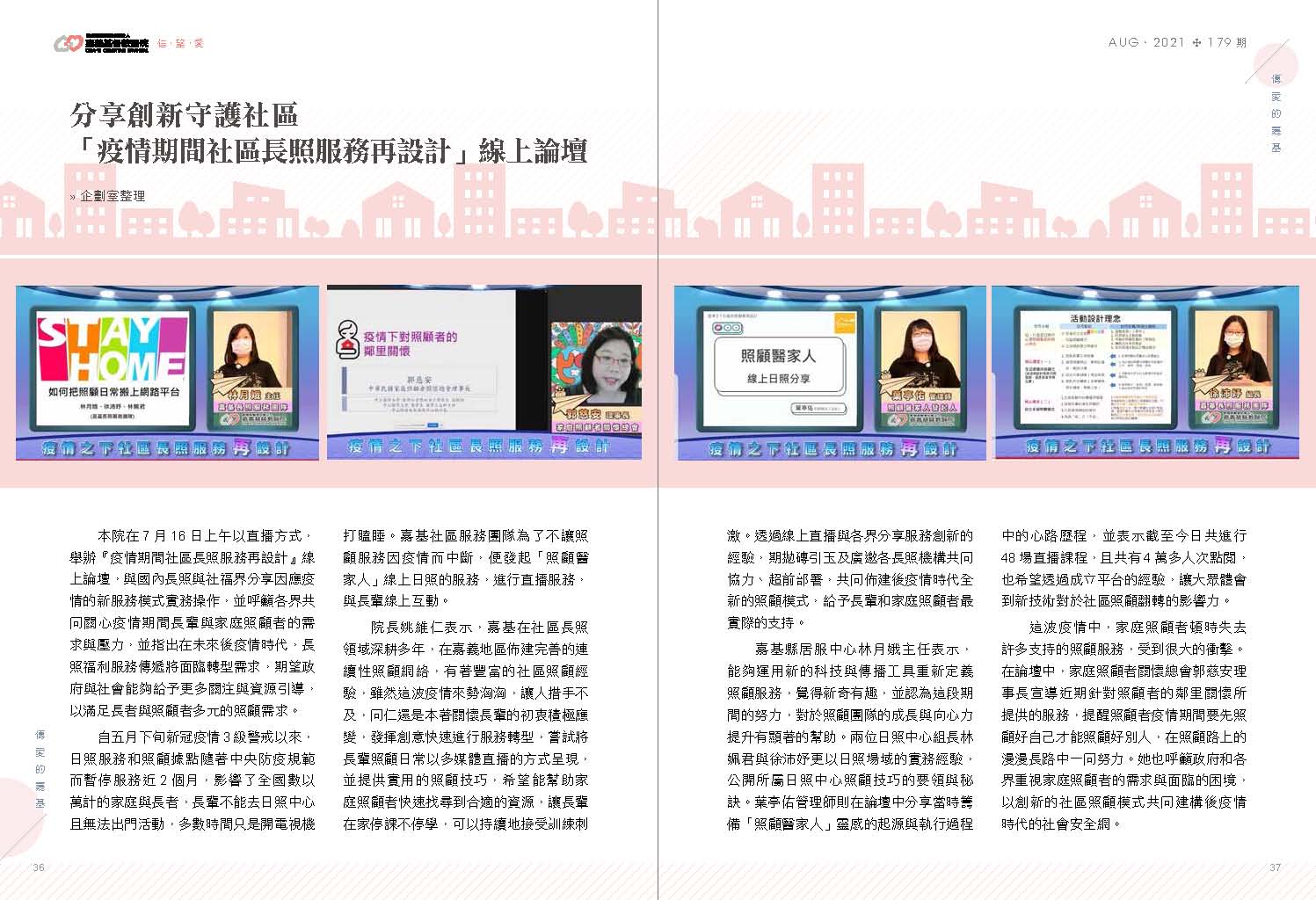 本院在7月16日上午以直播方式,舉辦『疫情期間社區長照服務再設計』線上論壇,與國內長照與社福界分享因應疫情的新服務模式實務操作,並呼籲各界共同關心疫情期間長輩與家庭照顧者的需求與壓力,並指出在未來後疫情時代,長照福利服務傳遞將面臨轉型需求,期望政府與社會能夠給予更多關注與資源引導,以滿足長者與照顧者多元的照顧需求。