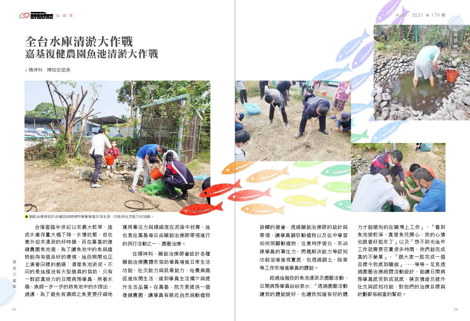 台灣面臨半世紀以來最大乾旱,造成水庫存量大幅下降、水情吃緊,但也意外迎來清淤的好時機,而在嘉基的復健農園魚池裡,為了讓魚池中的魚與植物能夠有個良好的環境,這段期間也正上演著同樣的戲碼:清理魚池淤泥。不同的是這裡沒有大型機具的協助,只有一群認真努力的日間病房學員,用著水桶、漁網一步一步的將魚池中的水撈出,過濾,為了避免有漏網之魚更要仔細地運用專注力與精細度在泥濘中找尋,這也是在嘉基每日由職能治療師帶領進行的例行活動之一,園藝治療。