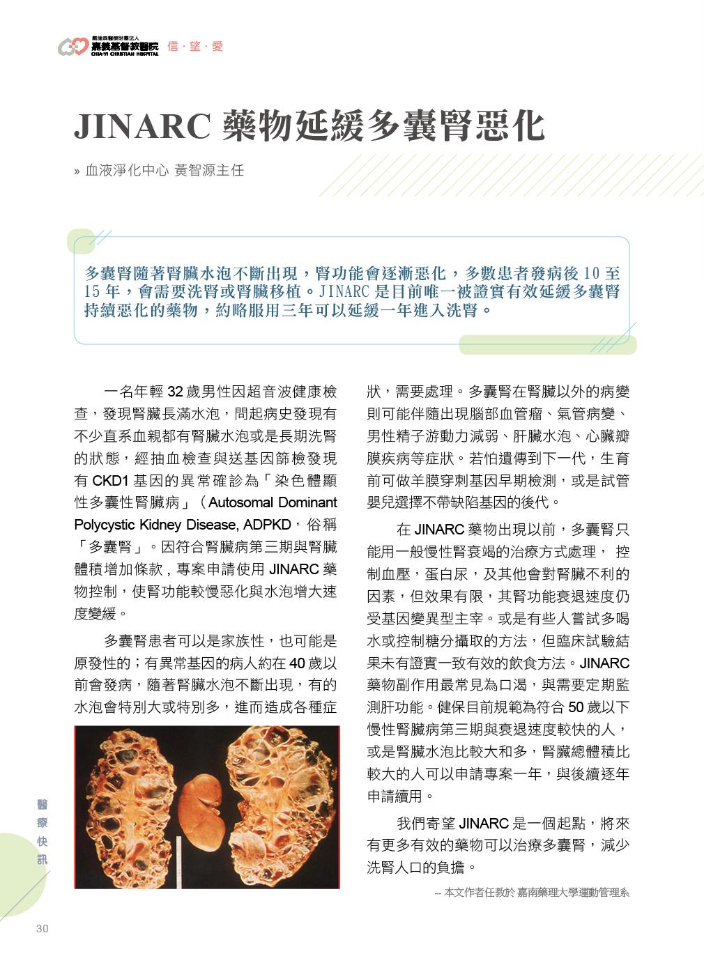 一名年輕32歲男性因超音波健康檢查,發現腎臟長滿水泡,問起病史發現有不少直系血親都有腎臟水泡或是長期洗腎的狀態,經抽血檢查與送基因篩檢發現有CKD1基因的異常確診為「染色體顯性多囊性腎臟病」(Autosomal Dominant Polycystic Kidney Disease, ADPKD,俗稱「多囊腎」。因符合腎臟病第三期與腎臟體積增加條款, 專案申請使用JINARC藥物控制,使腎功能較慢惡化與水泡增大速度變緩。