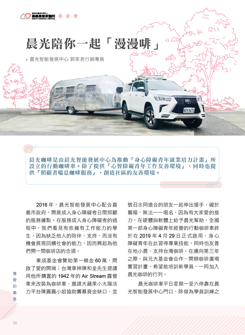 晨光咖啡是由晨光智能發展中心為推動「身心障礙青年就業培力計畫」所設立的行動咖啡車。除了提供「心智障礙青年工作友善環境」,同時也提供「照顧者喘息咖啡服務」,創造社區的友善環境。