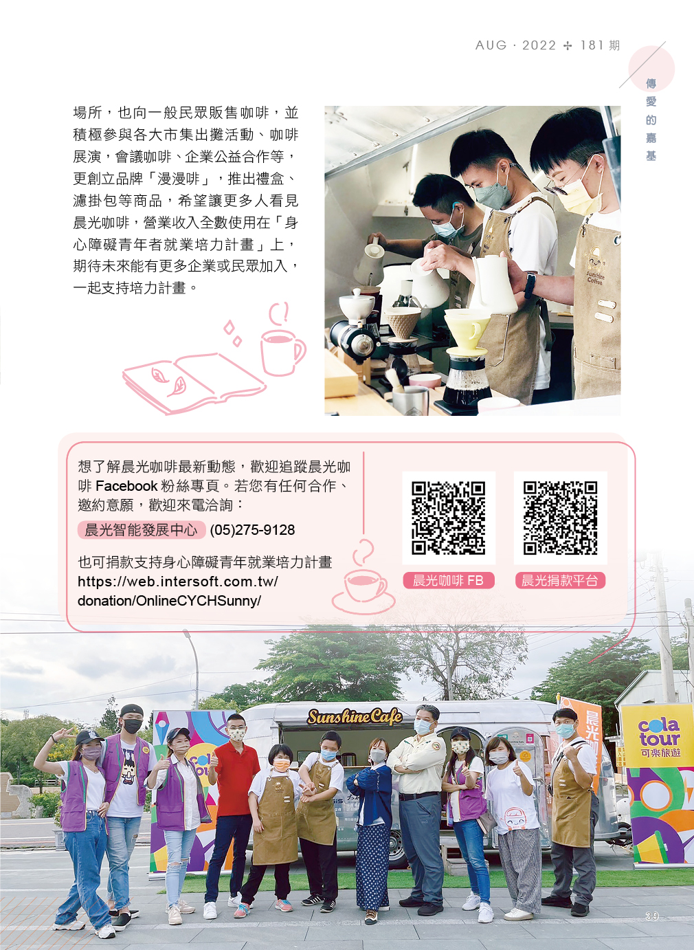 晨光咖啡車平日星期一至六停靠在晨光智能發展中心門口,除做為學員訓練之場所,也向一般民眾販售咖啡,並積極參與各大市集出攤活動、咖啡展演,會議咖啡、企業公益合作等,更創立品牌「漫漫啡」,推出禮盒、濾掛包等商品,希望讓更多人看見晨光咖啡,營業收入全數使用在「身心障礙青年者就業培力計畫」上,未來希望能有更多企業或民眾加入,一起支持培力計畫。想了解晨光咖啡最新動態,歡迎追蹤晨光咖啡Facebook粉絲專頁。若您有任何合作、邀約意願,歡迎來電洽詢:晨光智能發展中心 05-2759128;也可捐款支持身心障礙青年就業培力計畫:https://web.intersoft.com.tw/donation/OnlineCYCHSunny/
