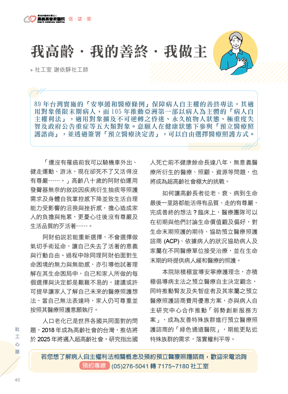 若您想了解病人自主權利法相關概念及預約預立醫療照護諮商,歡迎來電洽詢。預約專線05-2765041轉7175-7180社工室