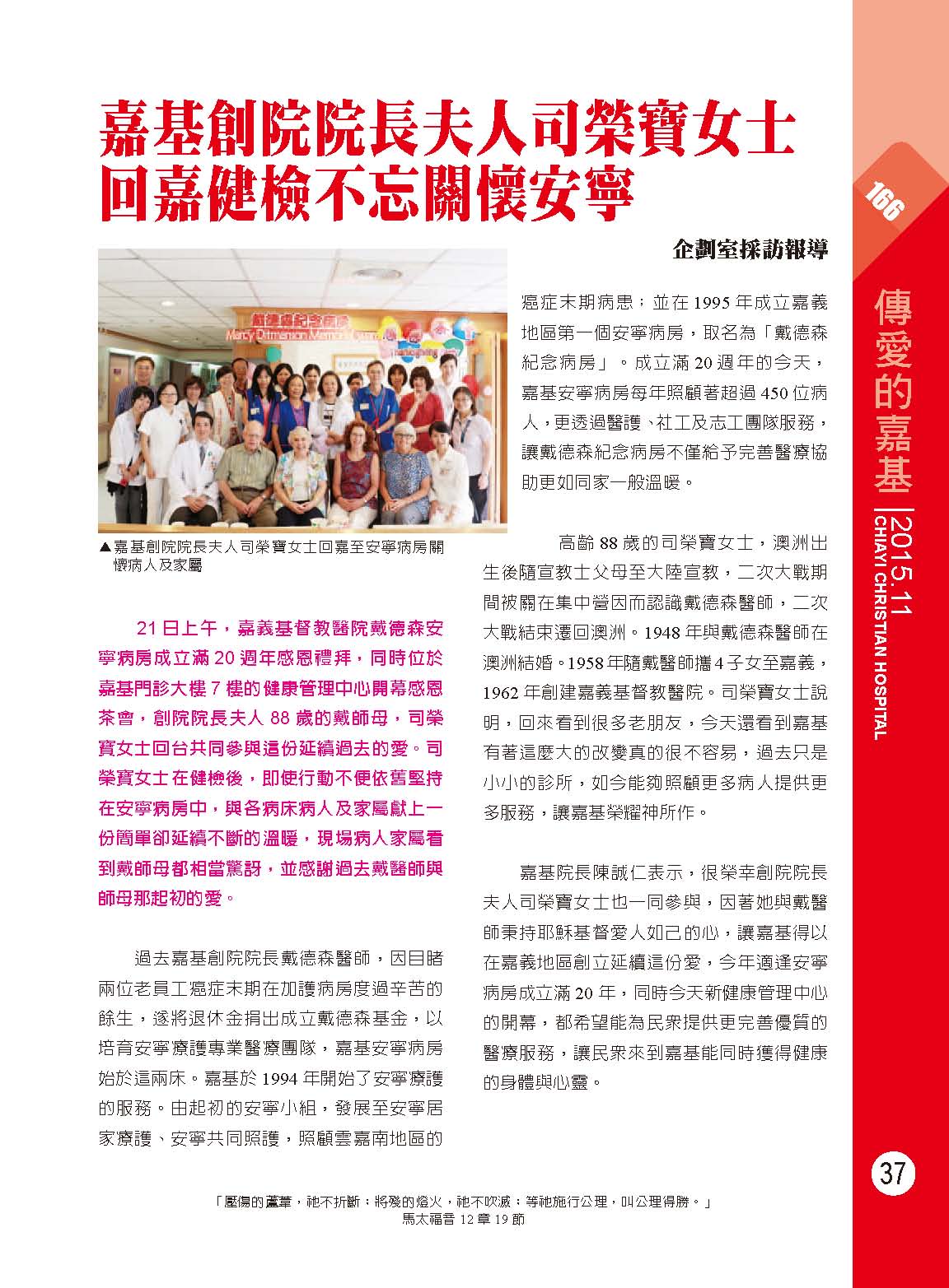 嘉基創院院長夫人司榮寶女士 回家健檢不忘關懷安寧