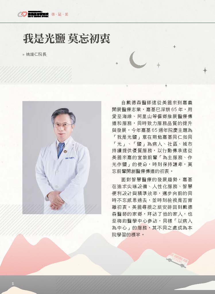 自戴德森醫師遠從美國來到嘉義開展醫療志業,嘉基已深耕65年,用愛至海線、阿里山等偏鄉推展醫療傳道和服務,同時致力服務品質的提升與發展,今年嘉基65週年院慶主題為「我是光鹽」意在期勉嘉基同仁如同「光」、「鹽」為病人、社區、城市持續提供優質服務,以行動傳承遠從美國來嘉的宣教前輩「為主服務、作光作鹽」的使命,時刻保持謙卑,莫忘前輩開創醫療傳道的初衷。