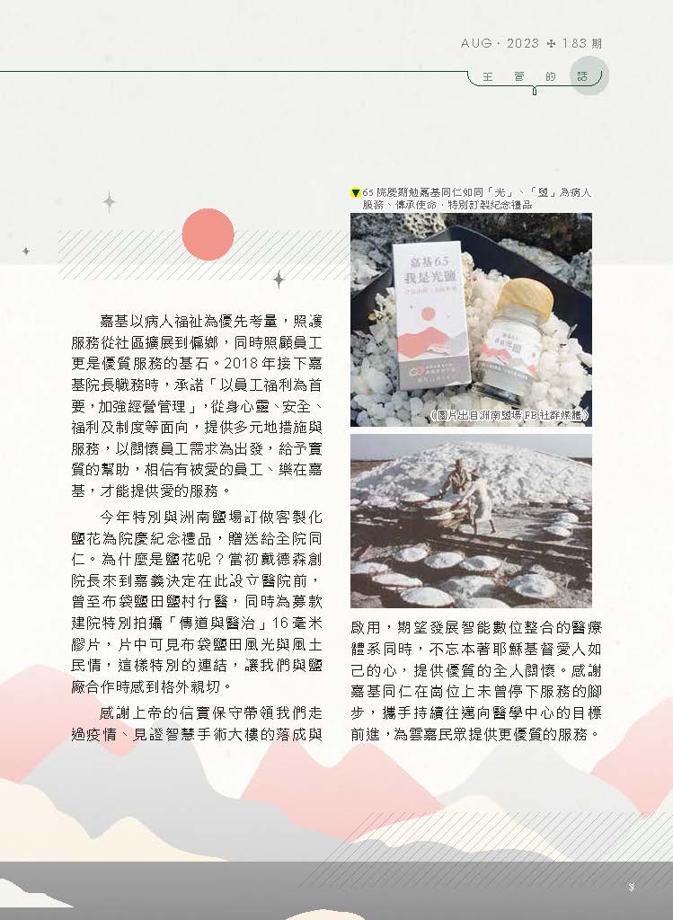 今年特別與洲南鹽場訂做客製化鹽花為院慶紀念禮品,贈送給全院同仁。為什麼是鹽花呢?當初戴德森創院長來到嘉義決定在此設立醫院前,曾至布袋鹽田鹽村行醫,同時為募款建院特別拍攝「傳道與醫治」16毫米膠片,片中可見布袋鹽田風光與風土民情,這樣特別的連結,讓我們與鹽廠合作時感到格外親切。