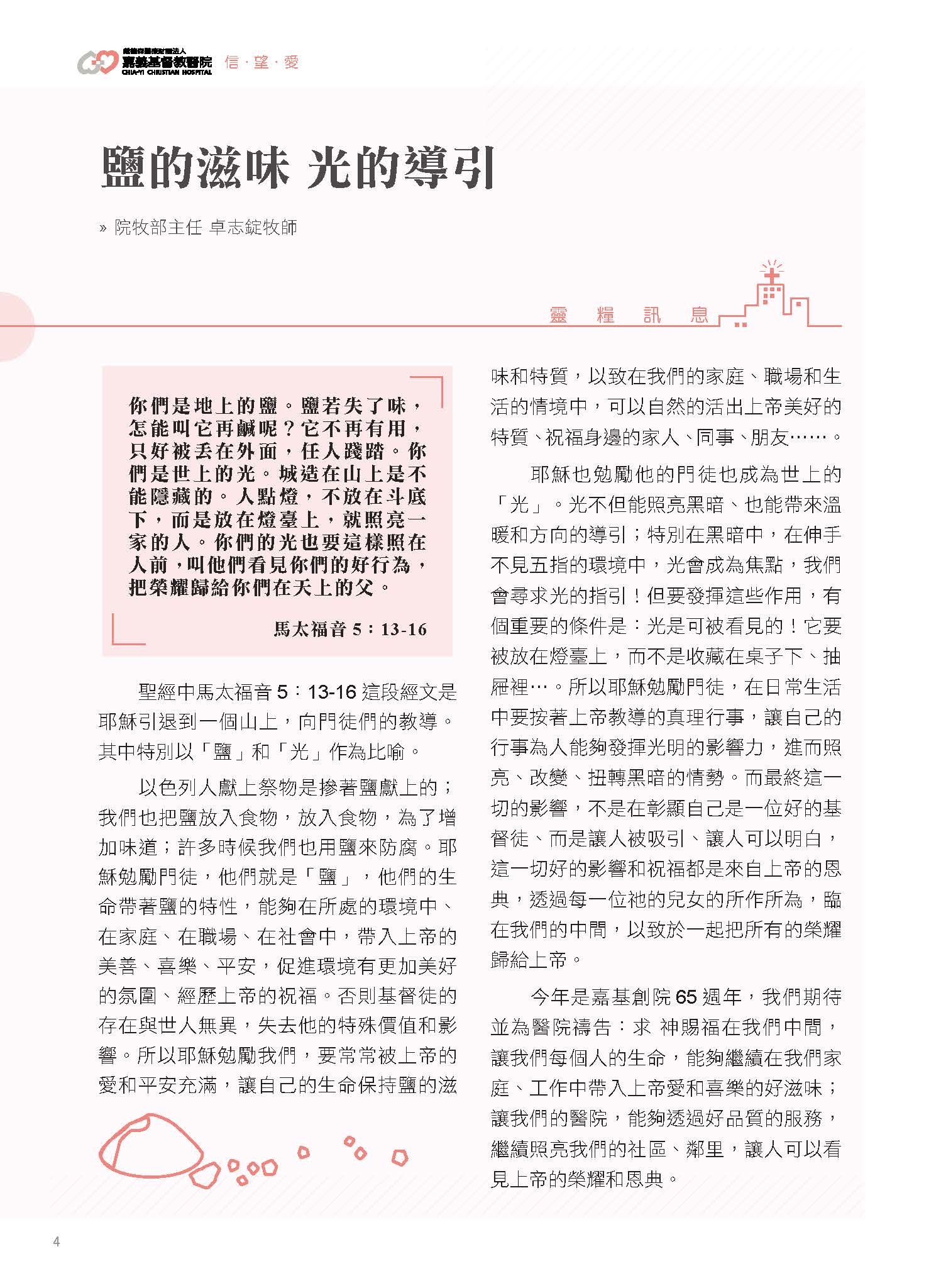 今年是嘉基創院65週年,我們期待並為醫院禱告:求 神賜福在我們中間,讓我們每個人的生命,能夠繼續在我們家庭、工作中帶入上帝愛和喜樂的好滋味;讓我們的醫院,能夠透過好品質的服務,繼續照亮我們的社區、鄰里,讓人可以看見上帝的榮耀和恩典。