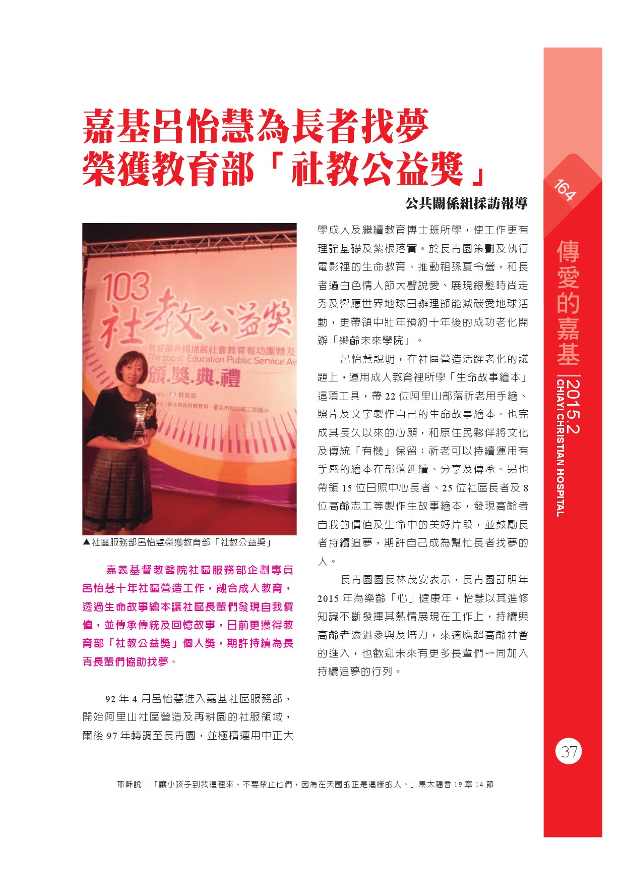 嘉基呂怡慧為長者找夢 榮獲教育部「社教公益獎」