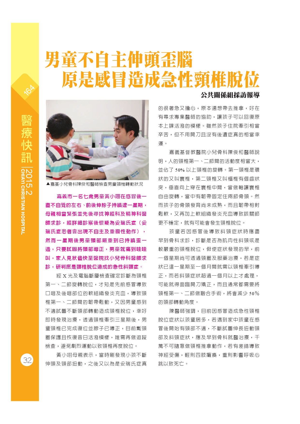 男童不自主伸頭歪腦 原是感冒造成急性頸椎脫位