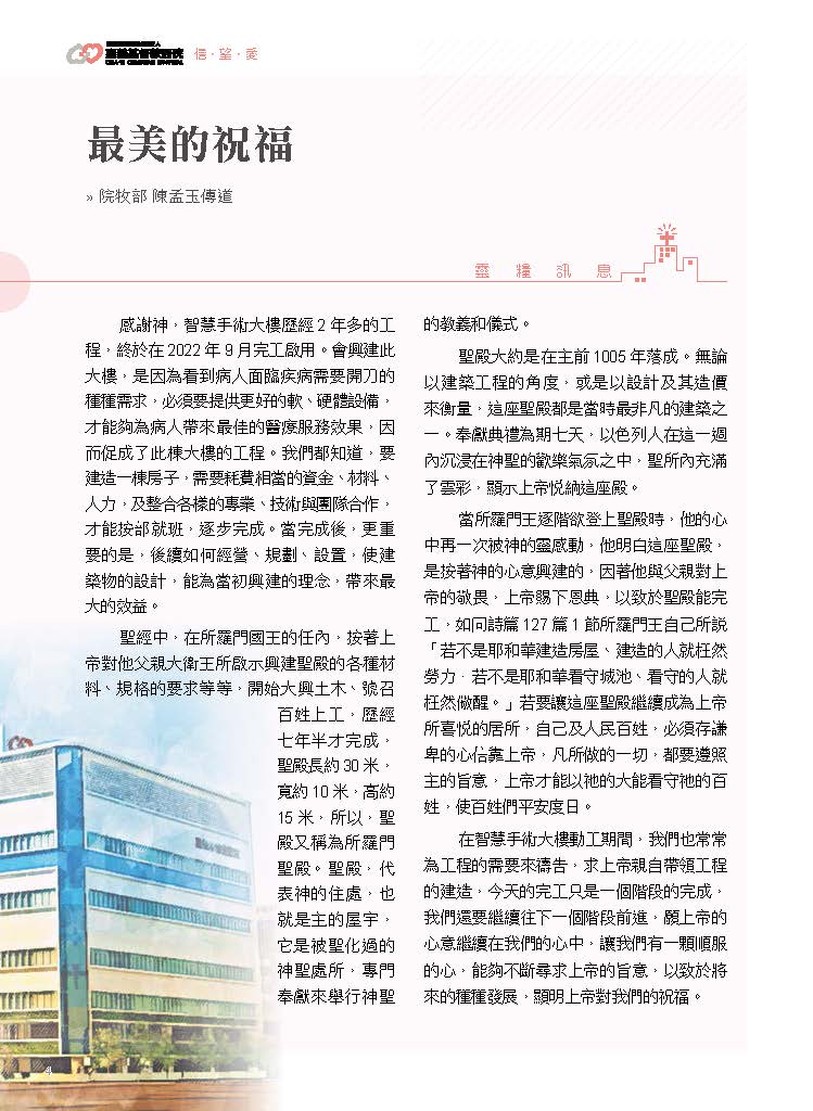 感謝神,智慧手術大樓歷經2年多的工程,終於在2022年9月完工啟用。會興建此大樓,是因為看到病人面臨疾病需要開刀的種種需求,必須要提供更好的軟、硬體設備,才能夠為病人帶來最佳的醫療服務效果,因而促成了此棟大樓的工程。我們都知道,要建造一棟房子,需要耗費相當的資金、材料、人力,及整合各樣的專業、技術與團隊合作,才能按部就班,逐步完成。當完成後,更重要的是,後續如何經營、規劃、設置,使建築物的設計,能為當初興建的理念,帶來最大的效益。