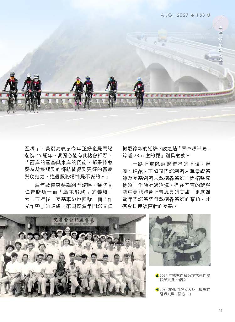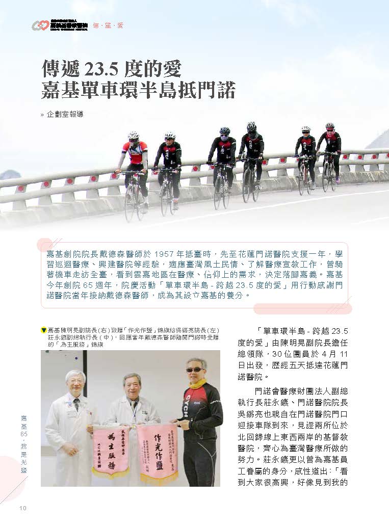 當年戴德森要離開門諾時,醫院同仁曾贈與一面「為主服務」的錦旗,六十五年後,嘉基車隊也回贈一面「作光作鹽」的錦旗,來回應當年門諾同仁對戴德森的期許,讓這趟「單車環半島–跨越23.5度的愛」別具意義。