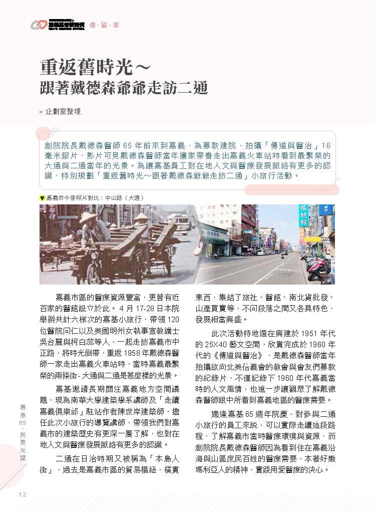 創院院長戴德森醫師60年前來到嘉義,為募款建院,拍攝「傳道與醫治」16毫米膠片,影片可見戴德森醫師當年攜家帶眷走出嘉義火車站時看到最繁榮的大通與二通當年的光景。為讓嘉基員工對在地人文與醫療發展脈絡有更多的認識,特別規劃「重返舊時光〜跟著戴德森爺爺走訪二通」小旅行活動。
