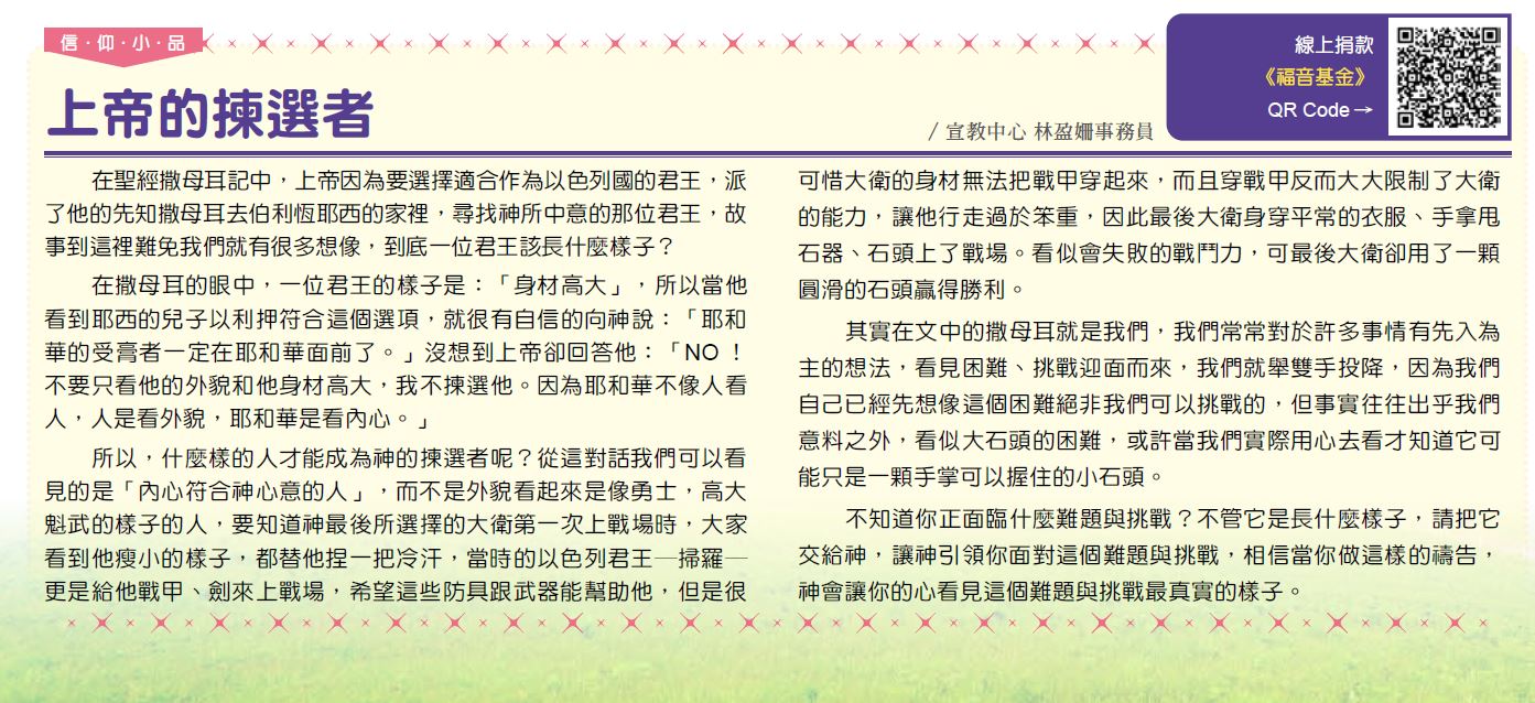 在聖經撒母耳記中,上帝因為要選擇適合作為以色列國的君王,派了他的先知撒母耳去伯利恆耶西的家裡,尋找神所中意的那位君王,故事到這裡難免我們就有很多想像,到底一位君王該長什麼樣子?在撒母耳的眼中,一位君王的樣子是:「身材高大」,所以當他看到耶西的兒子以利押符合這個選項,就很有自信的向神說:「耶和華的受膏者一定在耶和華面前了。」沒想到上帝卻回答他:「NO !不要只看他的外貌和他身材高大,我不揀選他。因為耶和華不像人看人,人是看外貌,耶和華是看內心。」所以,什麼樣的人才能成為神的揀選者呢?從這對話我們可以看見的是「內心符合神心意的人」,而不是外貌看起來是像勇士,高大魁武的樣子的人,要知道神最後所選擇的大衛第一次上戰場時,大家看到他瘦小的樣子,都替他捏一把冷汗,當時的以色列君王─掃羅─更是給他戰甲、劍來上戰場,希望這些防具跟武器能幫助他,但是很可惜大衛的身材無法把戰甲穿起來,而且穿戰甲反而大大限制了大衛的能力,讓他行走過於笨重,因此最後大衛身穿平常的衣服、手拿甩石器、石頭上了戰場。看似會失敗的戰鬥力,可最後大衛卻用了一顆