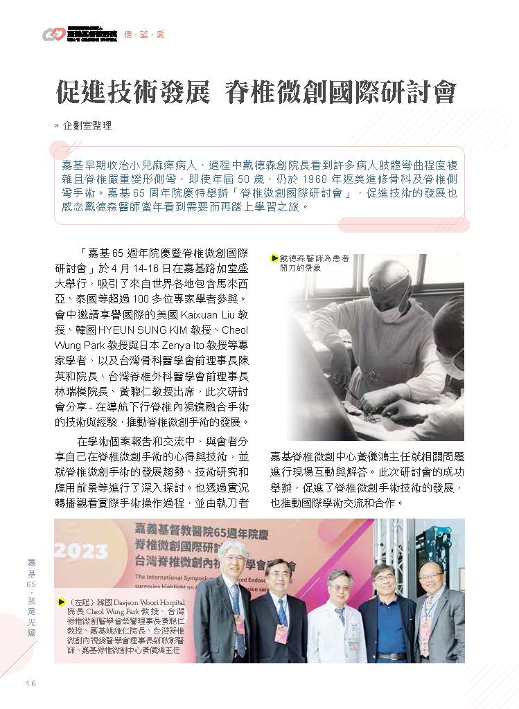 嘉基早期收治小兒麻痺病人,過程中戴德森創院長看到許多病人肢體彎曲程度複雜且脊椎嚴重變形側彎,即使年屆50歲,仍於1968年返美進修骨科及脊椎側彎手術。嘉基65周年院慶特舉辦「脊椎微創國際研討會」,促進技術的發展也感念戴德森醫師當年看到需要而再踏上學習之旅。