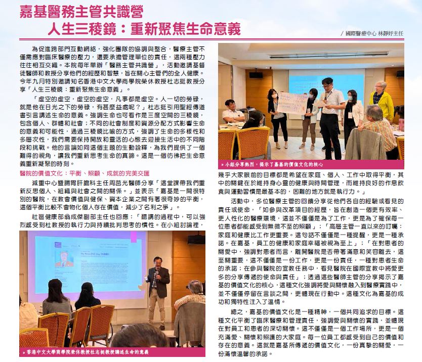 為促進跨部門互動網絡,強化團隊的協調與整合,醫療主管不僅需應對臨床醫療的壓力,還要承擔管理單位的責任,這兩種壓力往往相互交織。本院每年舉辦「醫務主管共識營」,活動邀請基督徒醫師和教授分享他們的經歷和智慧,旨在關心主管們的全人健康。今年九月特別邀請知名香港中文大學商學院榮休教授杜志挺教授分享「人生三稜鏡:重新聚焦生命意義」。