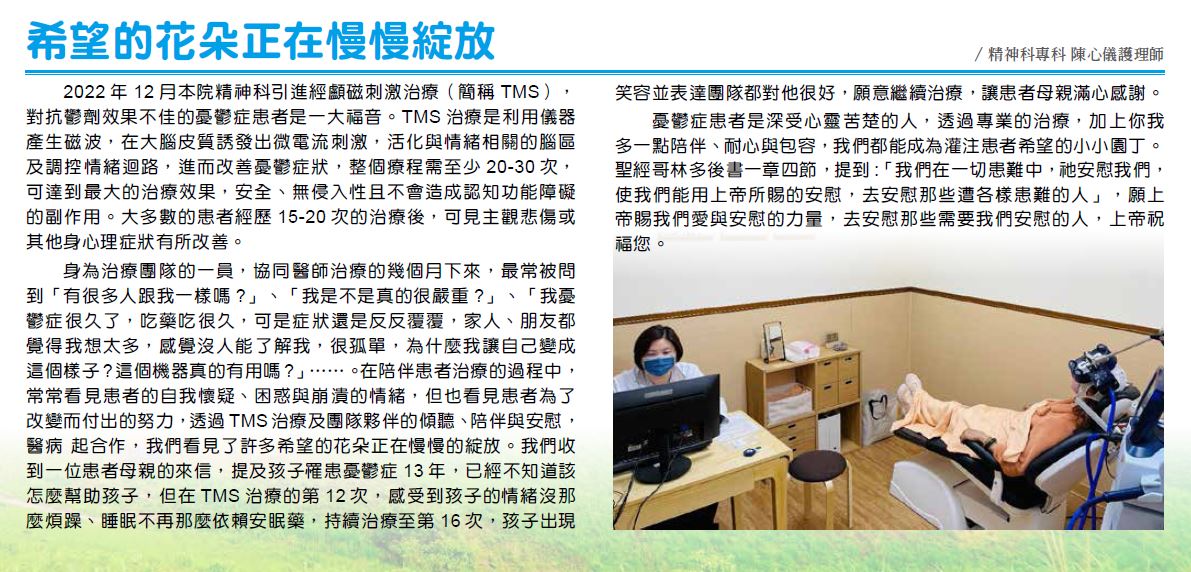2022 年12 月本院精神科引進經顱磁刺激治療(簡稱TMS),對抗鬱劑效果不佳的憂鬱症患者是一大福音。TMS 治療是利用儀器