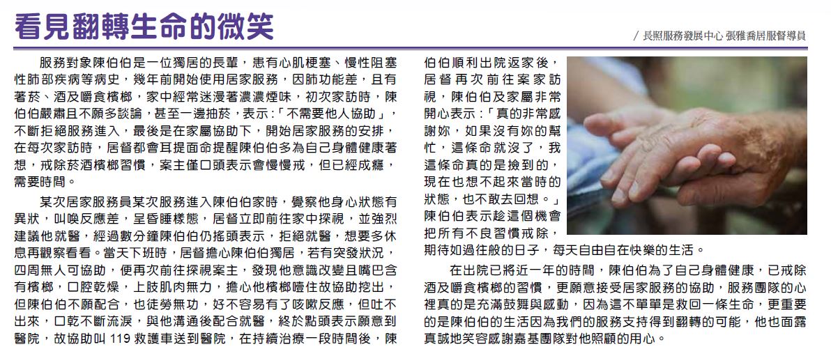 四周無人可協助,便再次前往探視案主,發現他意識改變且嘴巴含有檳榔,口腔乾燥,上肢肌肉無力,擔心他檳榔噎住故協助挖出,但陳伯伯不願配合,也徒勞無功,好不容易有了咳嗽反應,但吐不出來,口乾不斷流淚,與他溝通後配合就醫,終於點頭表示願意到醫院,故協助叫119 救護車送到醫院,在持續治療一段時間後,陳伯伯順利出院返家後,居督再次前往案家訪視,陳伯伯及家屬非常開心表示:「真的非常感謝妳,如果沒有妳的幫忙, 這條命就沒了, 我這條命真的是撿到的,現在也想不起來當時的狀態,也不敢去回想。」陳伯伯表示趁這個機會把所有不良習慣戒除,期待如過往般的日子,每天自由自在快樂的生活。在出院已將近一年的時間,陳伯伯為了自己身體健康,已戒除酒及嚼食檳榔的習慣,更願意接受居家服務的協助,服務團隊的心裡真的是充滿鼓舞與感動,因為這不單單是救回一條生命,更重要的是陳伯伯的生活因為我們的服務支持得到翻轉的可能,他也面露真誠地笑容感謝嘉基團隊對他照顧的用心。