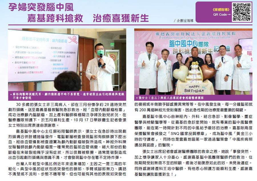30多歲的張女士非三高病人,卻在三月份懷孕約28週時突然劇烈頭痛,送至嘉義基督教醫院急診救治,經「血管內動脈瘤栓塞」成功治療顱內腦脈瘤,加上產科醫師積極關注孕婦及胎兒狀況,在醫療團隊照護下,於五月順利生產,10月17日舉辦慶生記者會張女士特別出席表達由衷謝意。