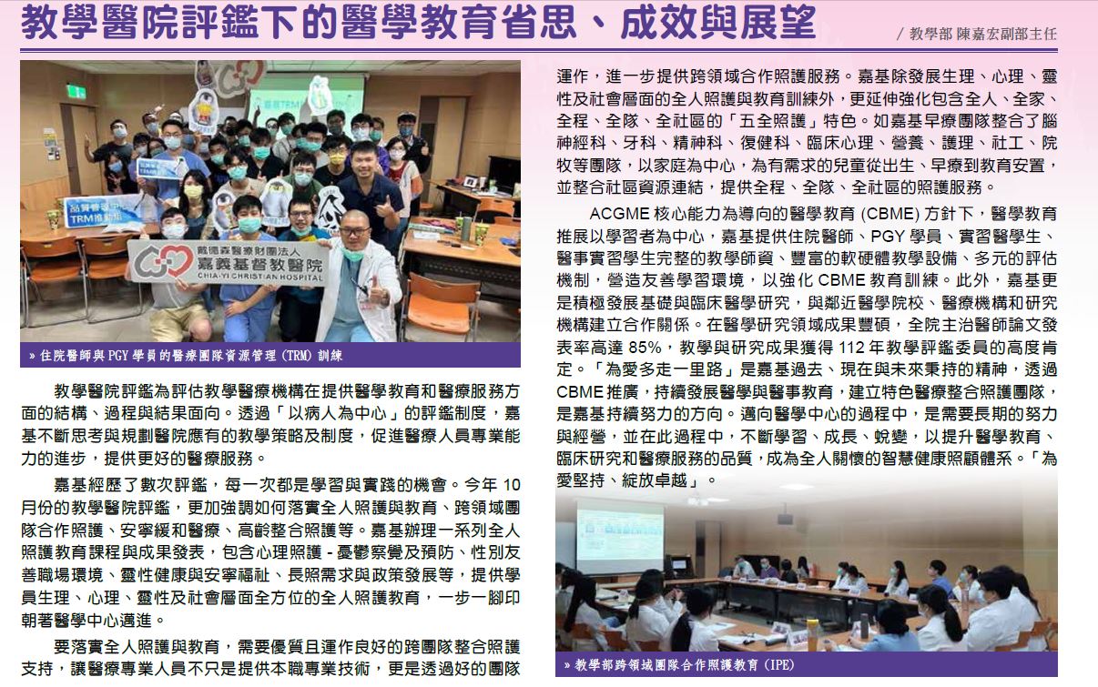 嘉基經歷了數次評鑑,每一次都是學習與實踐的機會。今年10月份的教學醫院評鑑,更加強調如何落實全人照護與教育、跨領域團隊合作照護、安寧緩和醫療、高齡整合照護等。嘉基辦理一系列全人照護教育課程與成果發表,包含心理照護-憂鬱察覺及預防、性別友善職場環境、靈性健康與安寧福祉、長照需求與政策發展等,提供學員生理、心理、靈性及社會層面全方位的全人照護教育,一步一腳印朝著醫學中心邁進。