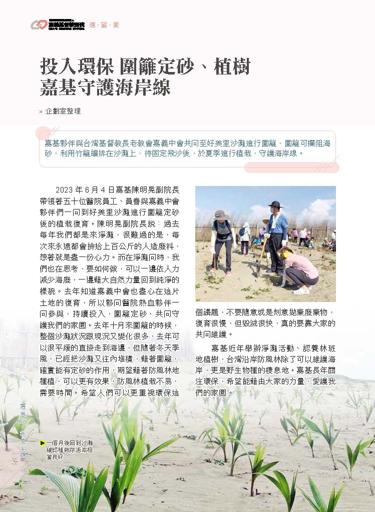 2023年6月4日嘉基陳明晃副院長帶領著五十位醫院員工、員眷與嘉義中會夥伴們一同到好美里沙灘進行圍籬定砂後的植栽復育。陳明晃副院長說:過去每年我們都是來淨灘,很難過的是,每次來永遠都會撿拾上百公斤的人造廢料,想著就是盡一份心力。而在淨灘同時,我們也在思考,要如何做,可以一邊依人力減少海廢,一邊藉大自然力量回到純淨的樣貌。去年知道嘉義中會也盡心在這片土地的復育,所以夥同醫院熱血夥伴一同參與,持續投入,圍籬定沙,共同守護我們的家園。去年十月來圍籬的時候,整個沙灘狀況跟現況又變化很多,去年可以很平緩的直接走到海邊,但隨著冬天季風,已經把沙灘又往內堆積,藉著圍籬,確實能有定沙的作用,期望藉著防風林地種植,可以更有效果,防風林植栽不易,需要時間。希望人們可以更重視環保這個議題,不要隨意或是刻意拋棄廢棄物,復育很慢,但毀滅很快,真的要靠大家的共同維護。