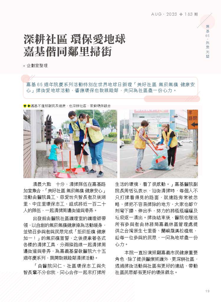 嘉基65週年院慶系列活動特別在世界地球日辦理「美好社區 無菸無檳 健康安心」掃街愛地球活動,響應環保也敦親睦鄰,共同為社區盡一份心力。