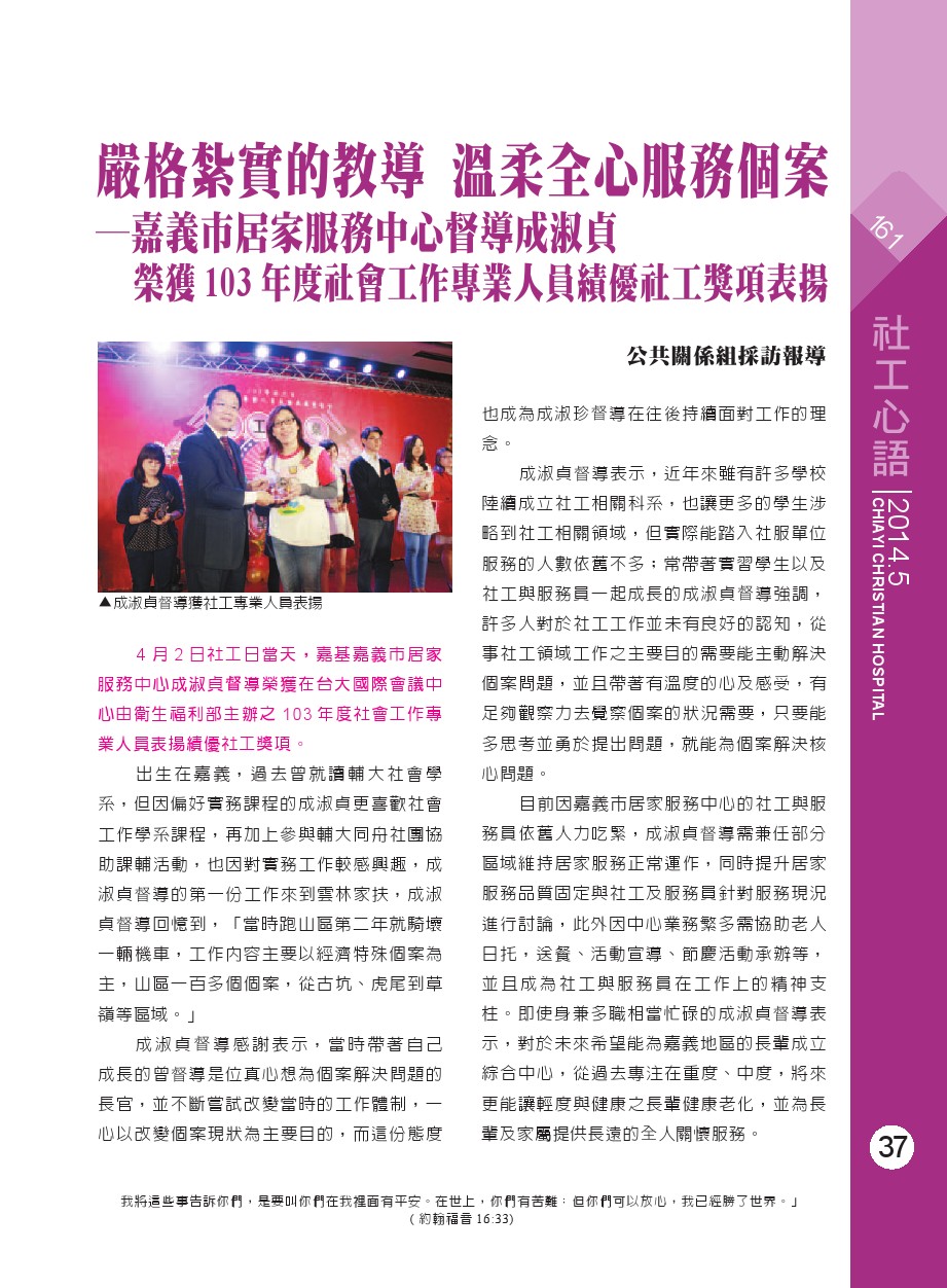 嘉義市居家服務中心督導成淑貞 榮獲103年度社會工作專業人員績優社工獎項表揚