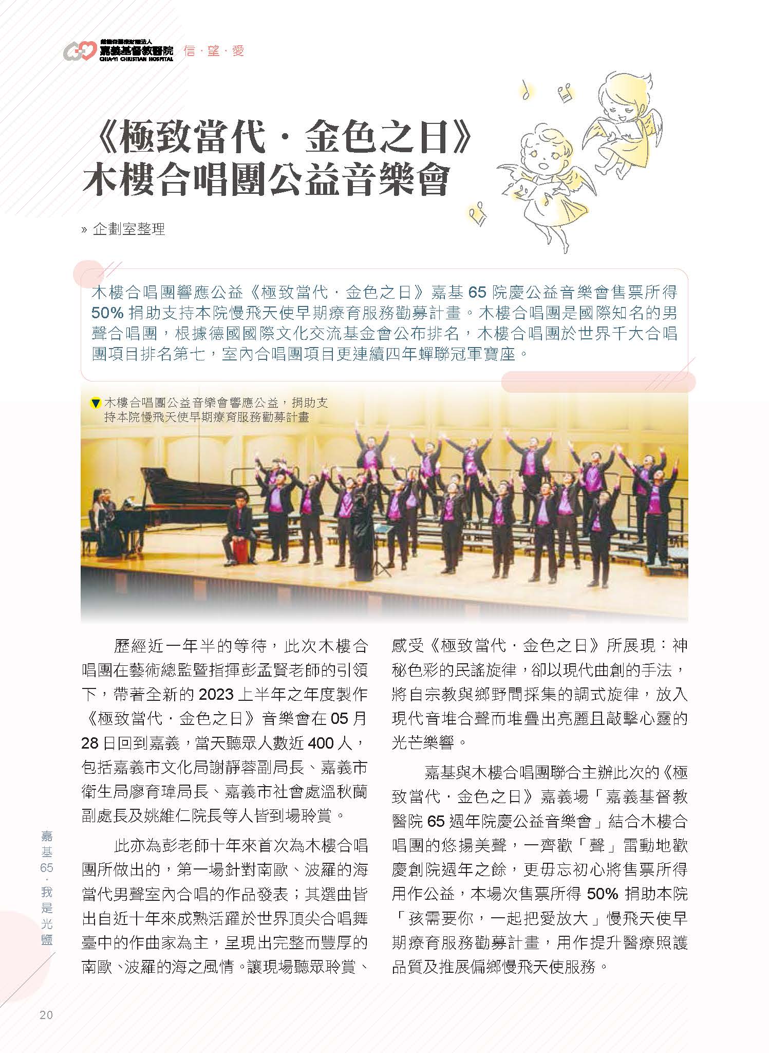 嘉基與木樓合唱團聯合主辦此次的《極致當代.金色之日》嘉義場「嘉義基督教醫院65週年院慶公益音樂會」結合木樓合唱團的悠揚美聲,一齊歡「聲」雷動地歡慶創院週年之餘,更毋忘初心將售票所得用作公益,本場次售票所得 50% 捐助本院「孩需要你,一起把愛放大」慢飛天使早期療育服務勸募計畫,提升醫療照護品質及推展偏鄉慢飛天使服務。