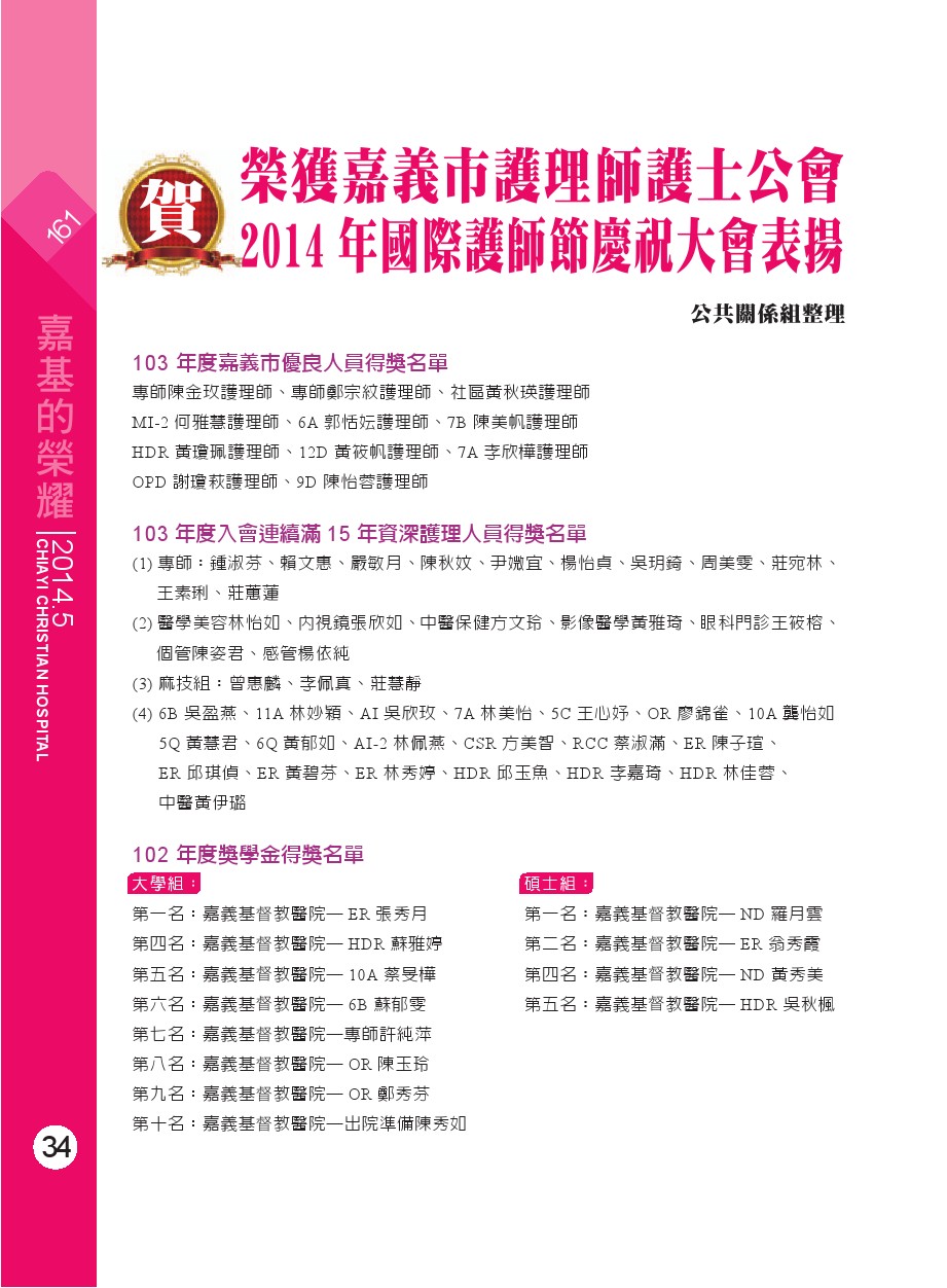 賀 榮獲嘉義市護理師護士公會2014 年國際護師節慶祝大會表揚
