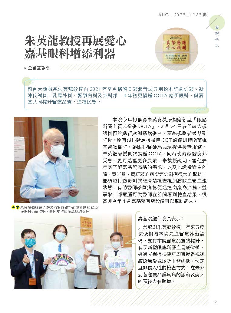 前台大機械系朱英龍教授自2021年至今捐贈5部超音波分別給本院急診部、新陳代謝科、乳房外科、腎臟內科、外科部,今年初更捐贈OCTA給予眼科,與嘉基共同提升醫療品質,造福民眾。