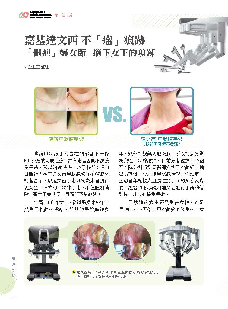 傳統甲狀腺手術會在頸部留下一條6-8公分的明顯疤痕,許多患者因此不願接受手術,延誤治療時機。嘉義基督教醫院特於3月8日舉行「嘉基達文西 甲狀腺切除 不瘤痕跡記者會」,以達文西手術系統為患者提供更安全、精準的甲狀腺手術,不僅腫塊消除,聲音不會沙啞,且頸部不留痕跡。