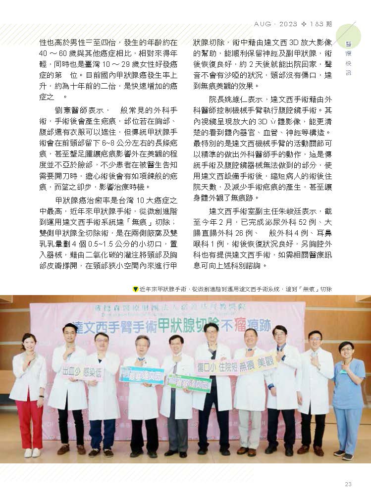 劉憲醫師指出,甲狀腺癌治癒率是台灣10大癌症之中最高,近年來甲狀腺手術,從微創進階到運用達文西手術系統達「無痕」切除;雙側甲狀腺全切除術,是在兩側腋窩及雙乳乳暈劃4個0.5~1.5公分的小切口,置入器械,藉由二氧化碳的灌注將頸部及胸部皮瓣撐開,在頸部狹小空間內來進行甲狀腺切除,術中藉由達文西3D放大影像的幫助,能順利保留神經及副甲狀腺,術後恢復良好,約2天後就能出院回家,聲音不會有沙啞的狀況,頸部沒有傷口,達到無痕美觀的效果。