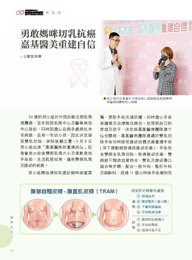 34歲的蔡小姐於外院診斷左側乳房侵襲癌,至嘉義基督教醫院院乳房中心及醫學美容中心就診,同時因擔心右側多處病灶未來病變,且有一年幼小孩,因此決定接受雙乳切除,以免後顧之憂。5月9日蔡小姐出席「嘉基醫美助重建自信」記者會表示術後雙側乳房大小及柔軟度如手術前,生活起居如常,僅有雙側乳房及腹部的疤痕。