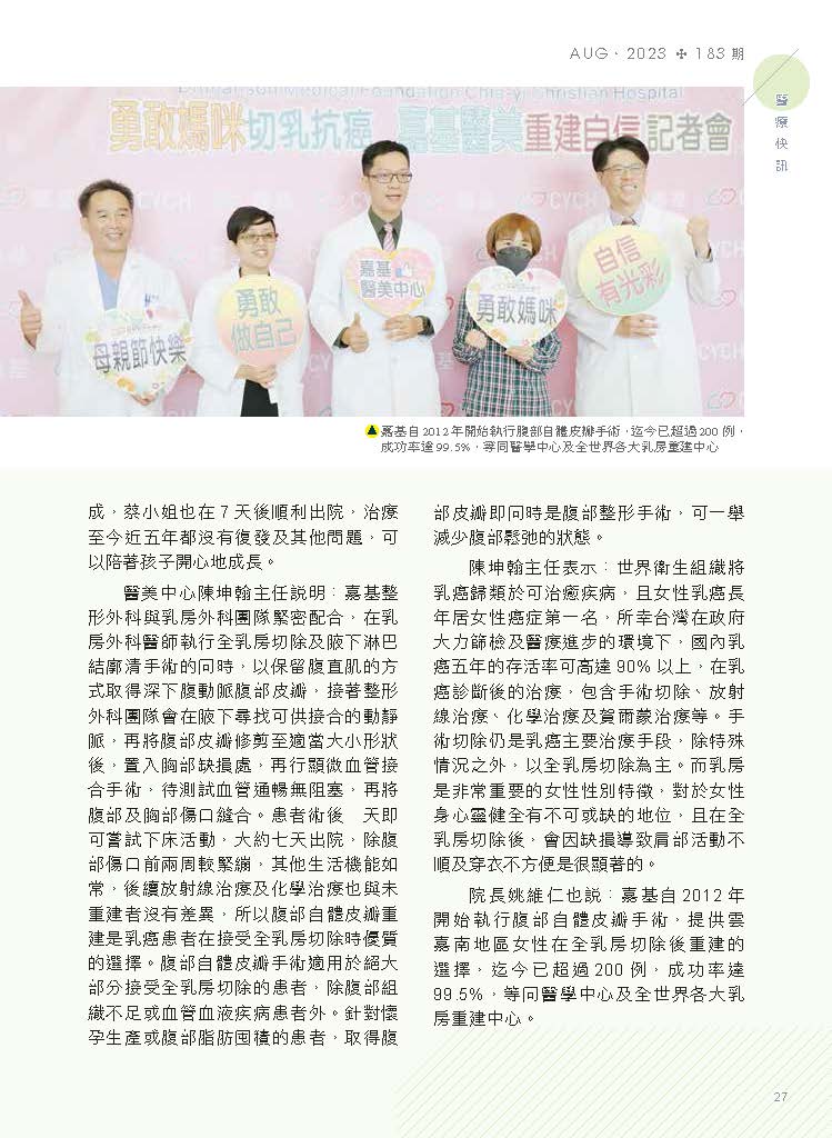 陳坤翰主任表示:世界衛生組織將乳癌歸類於可治癒疾病,且女性乳癌長年居女性癌症第一名,所幸台灣在政府大力篩檢及醫療進步的環境下,國內乳癌五年的存活率可高達90%以上,在乳癌診斷後的治療,包含手術切除、放射線治療、化學治療及賀爾蒙治療等。手術切除仍是乳癌主要治療手段,除特殊情況之外,以全乳房切除為主。而乳房是非常重要的女性性別特徵,對於女性身心靈健全有不可或缺的地位,且在全乳房切除後,會因缺損導致肩部活動不順及穿衣不方便是很顯著的。院長姚維仁也說:嘉基自2012年開始執行腹部自體皮瓣手術,提供雲嘉南地區女性在全乳房切除後重建的選擇,迄今已超過200例,成功率達99.5%,不亞於醫學中心及全世界各大乳房重建中心。