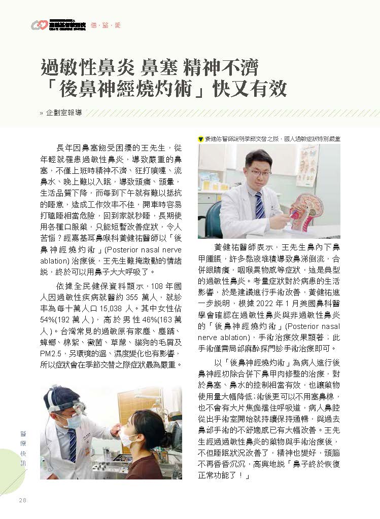 黃健祐醫師表示,王先生鼻內下鼻甲腫脹,許多黏液堆積導致鼻涕倒流,合併眼睛癢,咽喉異物感等症狀,這是典型的過敏性鼻炎。考量症狀對於病患的生活影響,於是建議進行手術改善,黃健祐進一步說明,根據2022年1月美國鼻科醫學會確認在過敏性鼻炎與非過敏性鼻炎的「後鼻神經燒灼術」(Posterior nasal nerve ablation),手術治療效果顯著;此手術僅需局部麻醉採門診手術治療即可。
