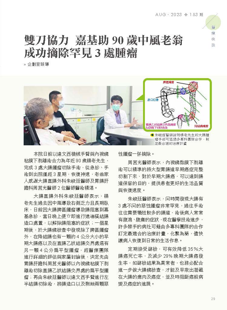 本院日前以達文西機械手臂與內視鏡粘膜下剝離術合力為年近90歲楊老先生,完成3處大腸腫瘤切除手術,從急診、手術到出院僅經3星期,恢復神速,老翁家人感謝大腸直腸外科朱峻廷醫師及胃腸肝膽科周莒光醫師2位醫師醫術精湛。