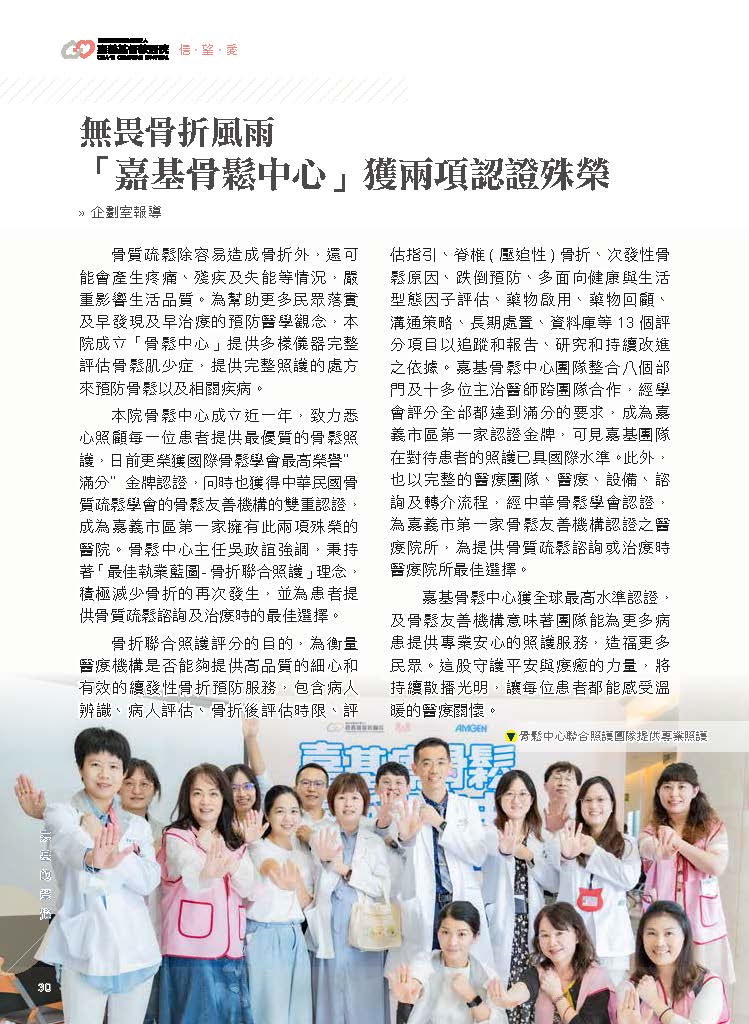 嘉基骨鬆中心獲全球最高水準認證,及骨鬆友善機構意味著團隊能為更多病患提供專業安心的照護服務,造福更多民眾。這股守護平安與療癒的力量,將持續散播光明,讓每位患者都能感受溫暖的醫療關懷。
