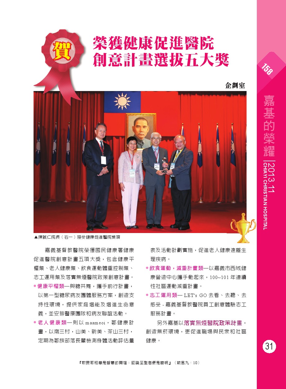 本院獲得2013年衛生福利部國民健康署健康促進醫院創意計畫選拔5大獎