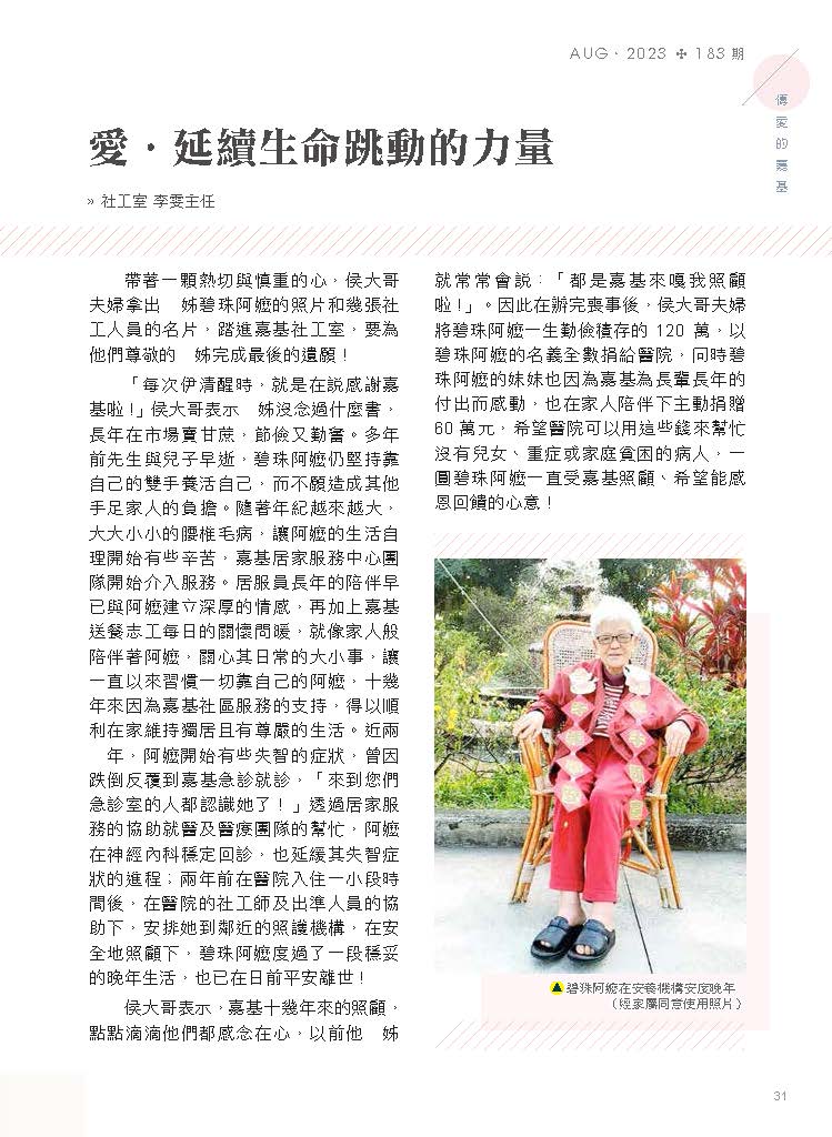 「每次伊清醒時,就是在說感謝嘉基啦!」侯大哥表示三姊沒念過什麼書,長年在市場賣甘蔗,節儉又勤奮。多年前先生與兒子早逝,碧珠阿嬤仍堅持靠自己的雙手養活自己,而不願造成其他手足家人的負擔。隨著年紀越來越大,大大小小的腰椎毛病,讓阿嬤的生活自理開始有些辛苦,嘉基居家服務中心團隊開始介入服務。居服員長年的陪伴早已與阿嬤建立深厚的情感,再加上嘉基送餐志工每日的關懷問暖,就像家人般陪伴著阿嬤,關心其日常的大小事,讓一直以來習慣一切靠自己的阿嬤,十幾年來因為嘉基社區服務的支持,得以順利在家維持獨居且有尊嚴的生活。近兩三年,阿嬤開始有些失智的症狀,曾因跌倒反覆到嘉基急診就診,「來到您們急診室的人都認識她了!」透過居家服務的協助就醫及醫療團隊的幫忙,阿嬤在神經內科穩定回診,也延緩其失智症狀的進程;兩年前在醫院入住一小段時間後,在醫院的社工師及出準人員的協助下,安排她到鄰近的照護機構,在安全地照顧下,碧珠阿嬤度過了一段穩妥的晚年生活,也已在日前平安離世!