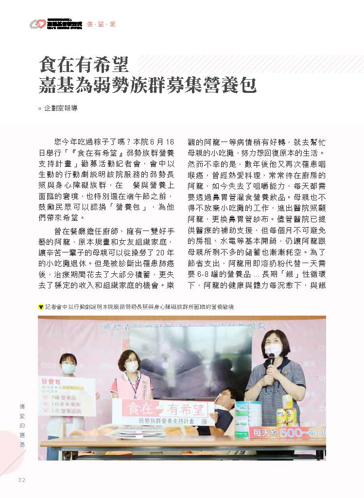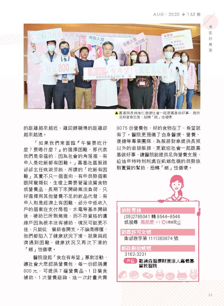 嘉基院長姚維仁說,醫院發起「食在有希望」募款活動,讓社會大眾認捐營養包,每一份認捐價800元,可提供7罐營養品、1日餐食補助、1次營養諮詢,這一次計畫共需9075份營養包,好的食物在了,希望就有了。醫院更預備了自身醫療、營養、復健等專業團隊,為服務對象提供長照以外的銜接服務,更歡迎社會一起跟嘉基做好事,讓醫院能提供足夠營養支援,給這些時時刻刻處在飢餓危機的弱勢族群實質的幫助,扭轉「餓」性循環。(捐款專線:(05)2765041轉8544~8546 或搜尋 嘉基愛+1)