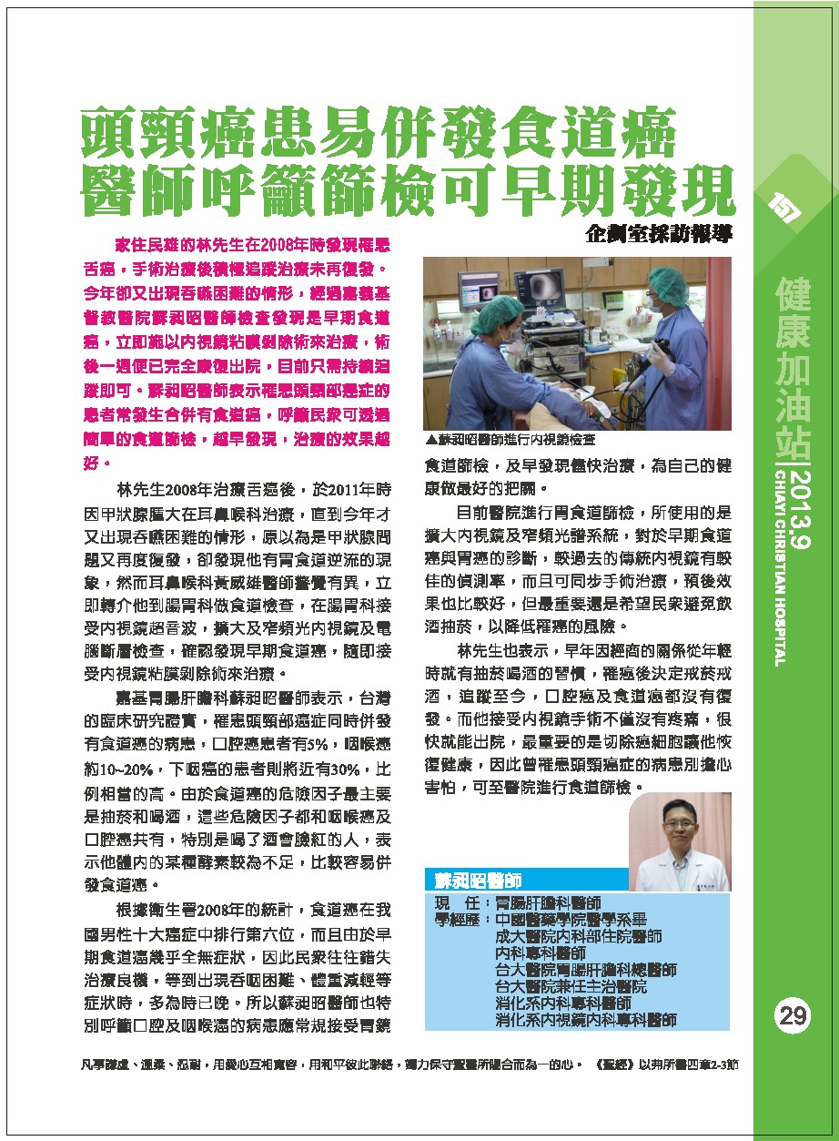 頭頸癌患易併發食道癌 醫師呼籲篩檢可早期發現