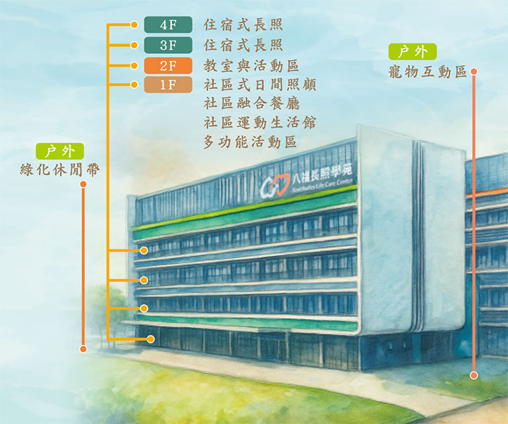 八福長照學苑將設立於嘉義民雄,預計於2025年底動工,設有日間照顧、全人服務與住宿型照護(57床及1隔離 床),滿足不同照護需求。秉持「Design-Care」理念,園區內更規劃大齡食堂、運動生活館及多元活動場域,助長者在生活中重現自我價值,以八大創新服務打造安心、溫暖的長照方舟。